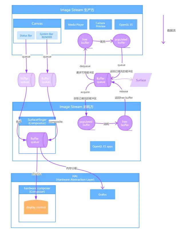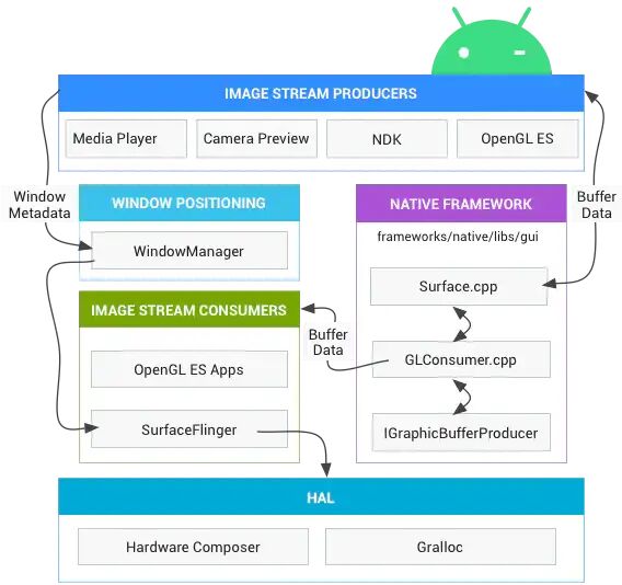 其中,graphic data称为Buffer,生产这些graphic data的Canvas、Media Player、Camera Preview等称为图形流生产方(Image Stream Producers)。