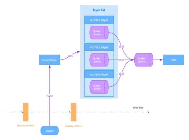 SurfaceFlinger收到VSYNC信号后,会遍历它的所有visible layers:如果该layer有新的buffer,获取它;如果没有,继续使用旧的buffer;如果该layer没有任何buffer,忽略它。