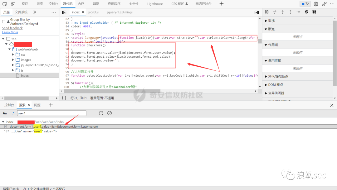 之前学过一点JS逆向,Ctrl + Shift + F,搜索被加密的参数 - user1,找到了加密函数(呜呜这个逆向好简单,丝毫没有展示出我的逆向技术)