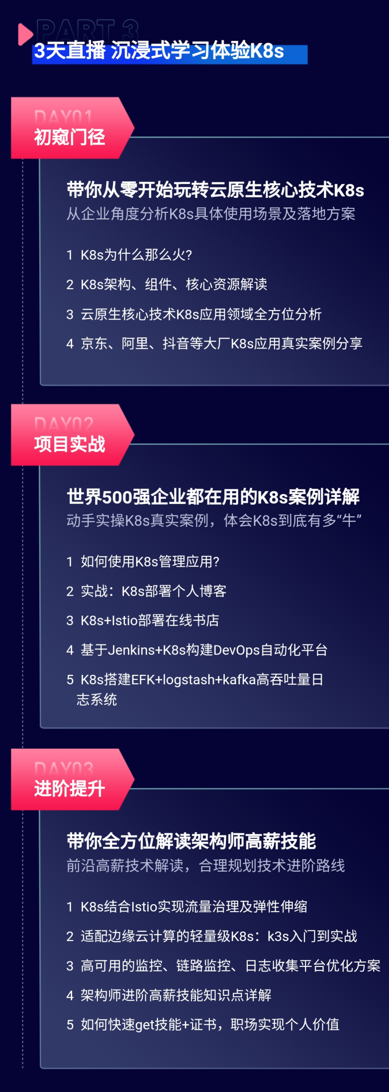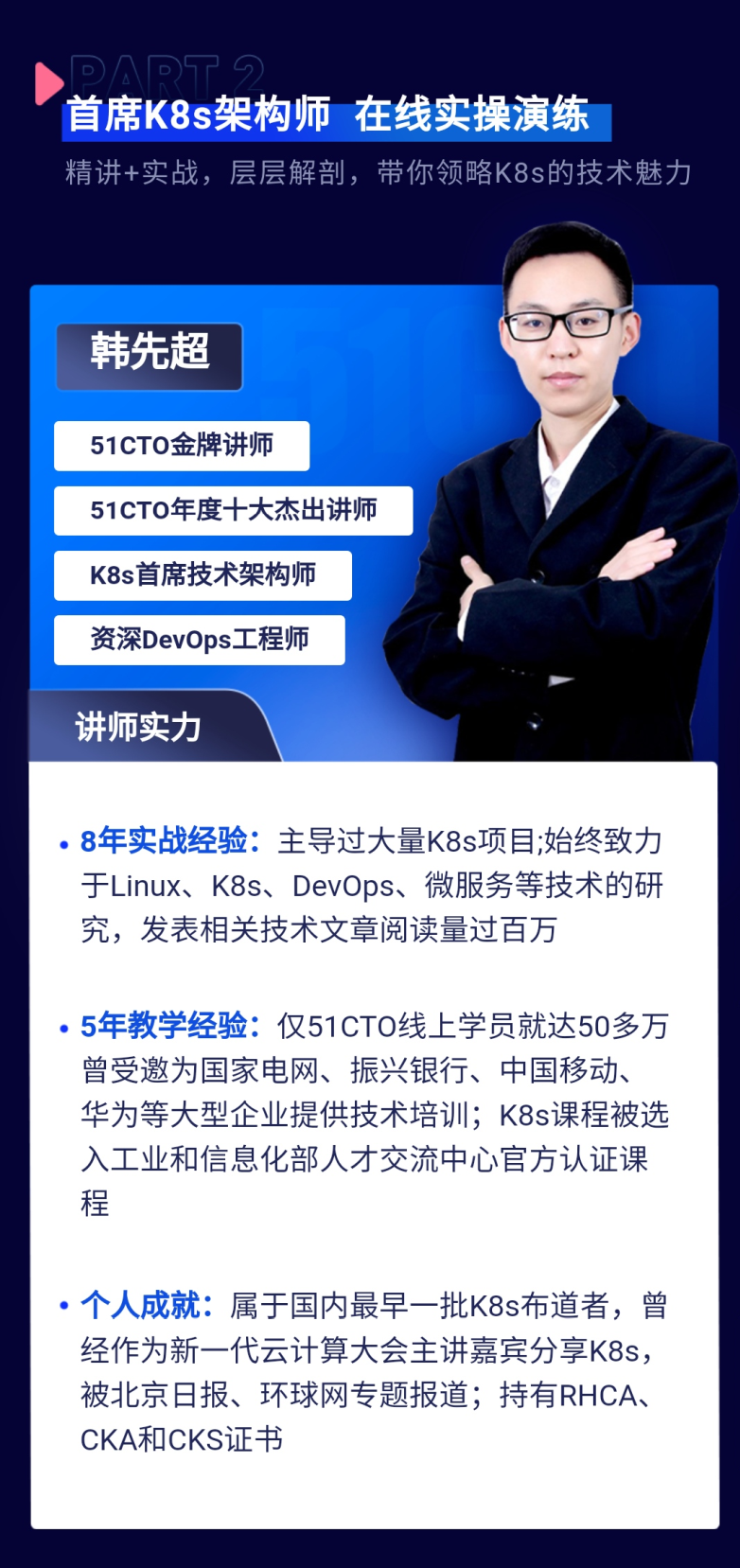 针对越来越多学员对于真正掌握K8s技术的诉求,51CTO与资深架构师韩先超联合推出《3天K8s直播训练营》,帮你梳理K8s知识体系、掌握K8s架构核心,带你体验实战沉浸式学习、讲师专业答疑,快速上手云原生时代最重要的技能。学完还可以考取CKA证书,对于想加薪、或者想跳槽的同学可谓一举两得。