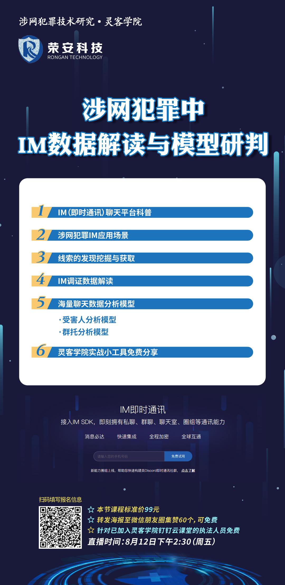 针对目前IM技术在涉网犯罪引流、推广等场景中应用有明显增量的趋势,涉网犯罪技术研究灵客学院第9期推出新课程《IM数据解读与模型分析》,在本周五面向公检法一线执法人员进行直播,欢迎大家积极关注、转发,为治理涉网犯罪贡献一份力量。