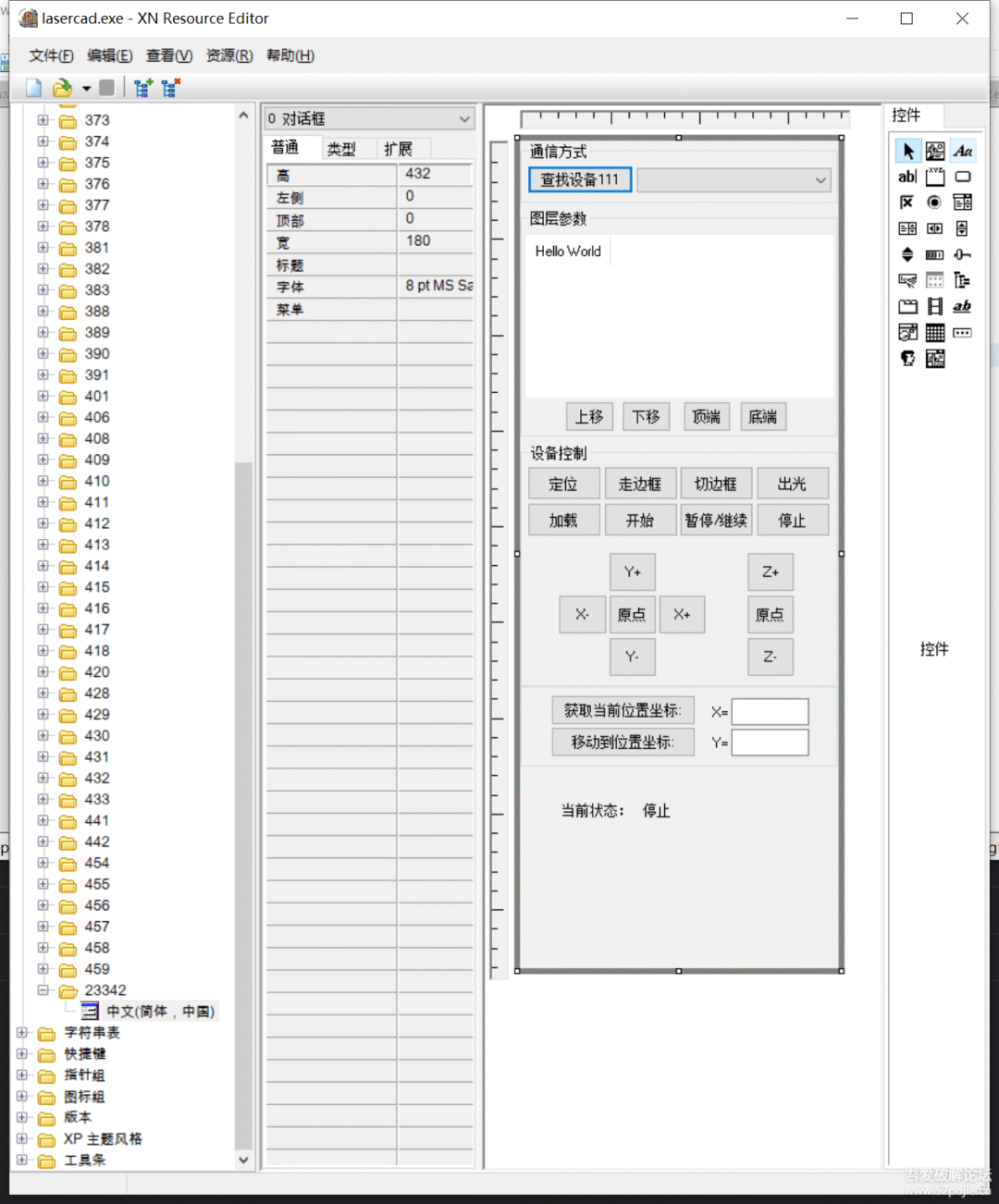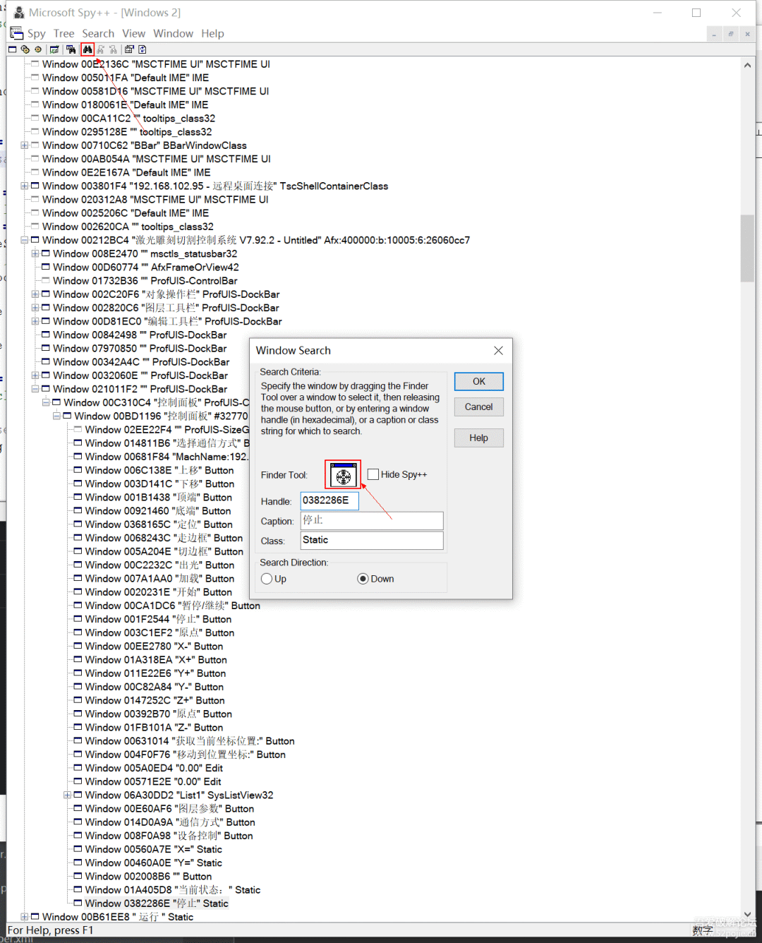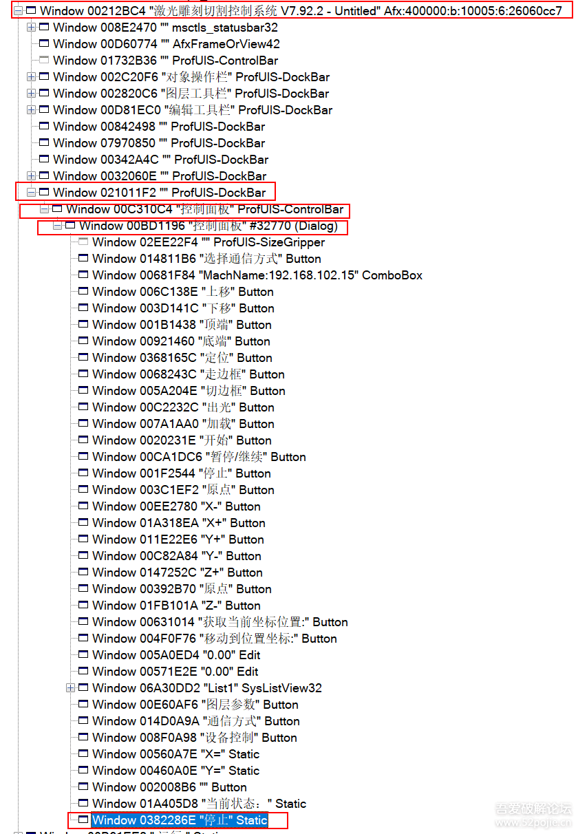 从上方看要获取到这个窗口的句柄需要至少5次查找 获取主窗口的句柄Afx:400000:b:10005:6:26060cc7(激光雕刻切割控制系统 V7.92.2 - Untitled) à 获取ProfUIS-DockBar à 获取ProfUIS-ControlBar(控制面板) à 获取#32770(控制面板)à 获取Static(停止) 通常获取窗口会使用 FindWindow API