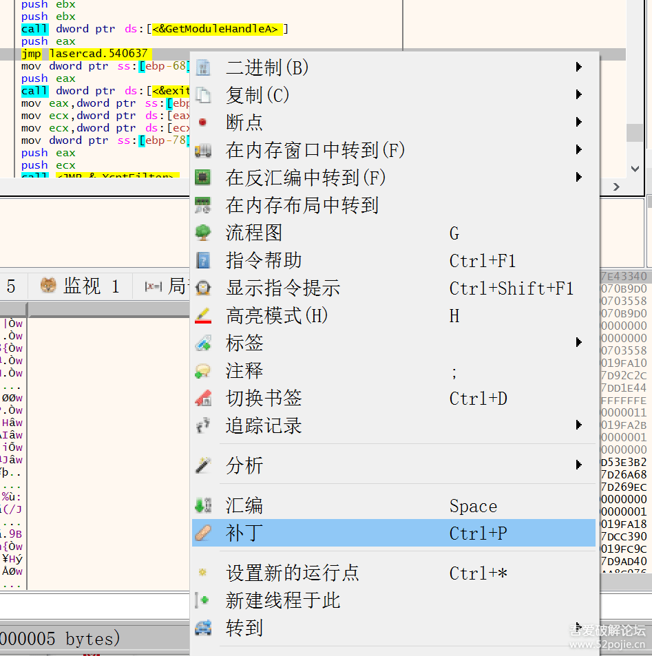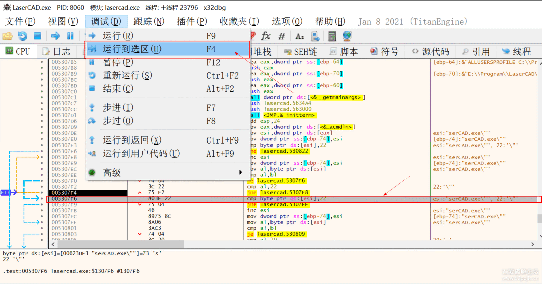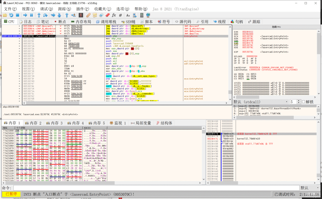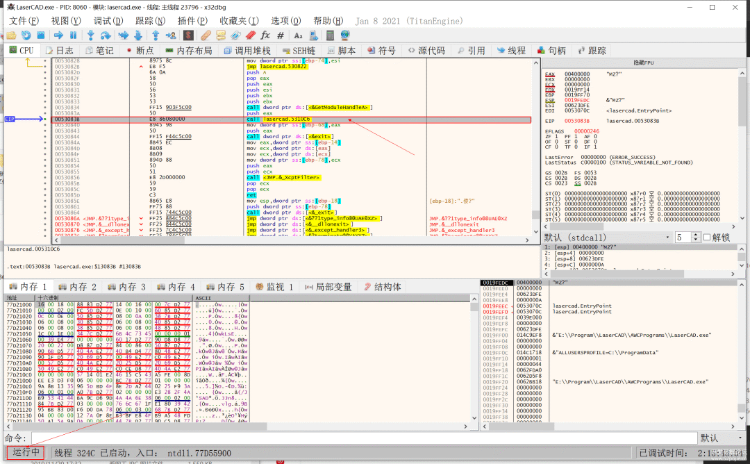 将LaserCAD.exe加载到x32dbg中 点击运行,会停在入口处