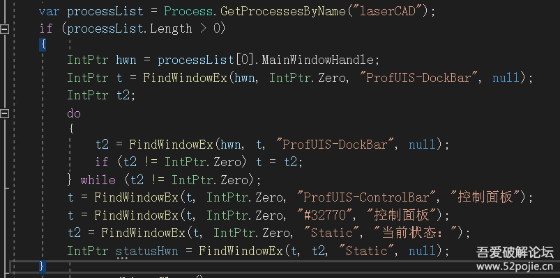 var processList = Process.GetProcessesByName("laserCAD");if (processList.Length > 0) {IntPtr hwn = processList[0].MainWindowHandle;IntPtr t = FindWindowEx(hwn, IntPtr.Zero, "ProfUIS-DockBar", null);IntPtr t2;do {t2 = FindWindowEx(hwn, t, "ProfUIS-DockBar", null);if (t2 != IntPtr.Zero)t = t2;} while (t2 != IntPtr.Zero);t = FindWindowEx(t, IntPtr.Zero, "ProfUIS-ControlBar", "控制面板");t = FindWindowEx(t, IntPtr.Zero, "#32770", "控制面板");t2 = FindWindowEx(t, IntPtr.Zero, "Static", "当前状态:");IntPtr statusHwn = FindWindowEx(t, t2, "Static", null);}