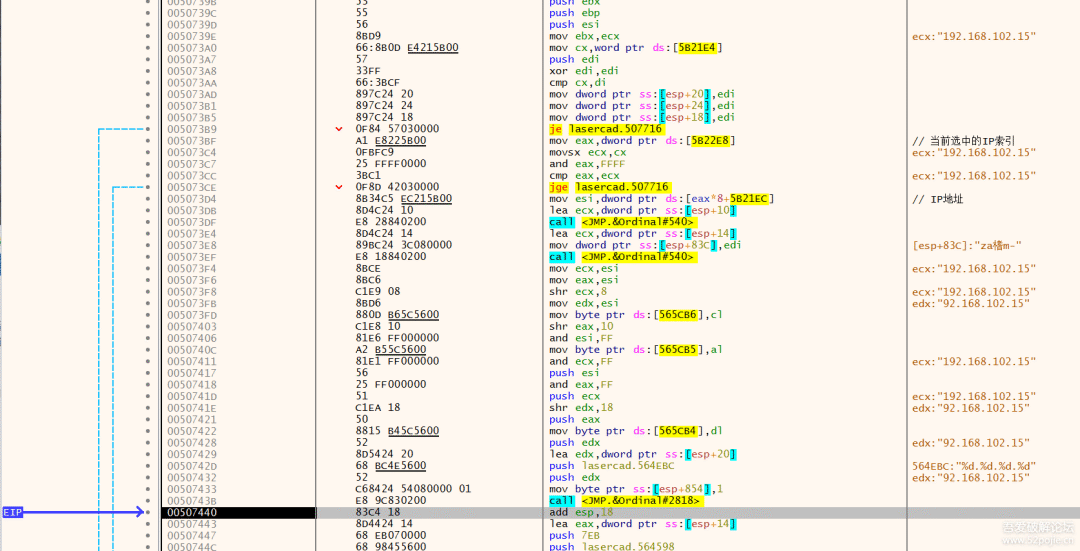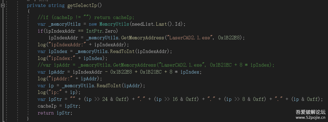 IntPtr ipIndexAddr = IntPtr.Zero;private string getSelectIp() {//if (cacheIp != "") return cacheIp;var _memoryUtils = new MemoryUtils(needList.Last().Id);if (ipIndexAddr == IntPtr.Zero)ipIndexAddr = _memoryUtils.GetMemoryAddress("LaserCAD2.1.exe", 0x1B22E8);log("ipIndexAddr:" + ipIndexAddr);var ipIndex = _memoryUtils.ReadToInt(ipIndexAddr);log("ipIndex:" + ipIndex);//var ipAddr = _memoryUtils.GetMemoryAddress("LaserCAD2.1.exe", 0x1B21EC + 8 * ipIndex);var ipAddr = ipIndexAddr - 0x1B22E8 + 0x1B21EC + 8 * ipIndex;log("ipAddr:" + ipAddr);var ip = _memoryUtils.ReadToInt(ipAddr);log("ip:" + ip);var ipStr = "" + (ip >> 24 & 0xff) + "." + (ip >> 16 & 0xff) + "." + (ip >> 8 & 0xff) + "." + (ip & 0xff);cacheIp = ipStr;return ipStr;}