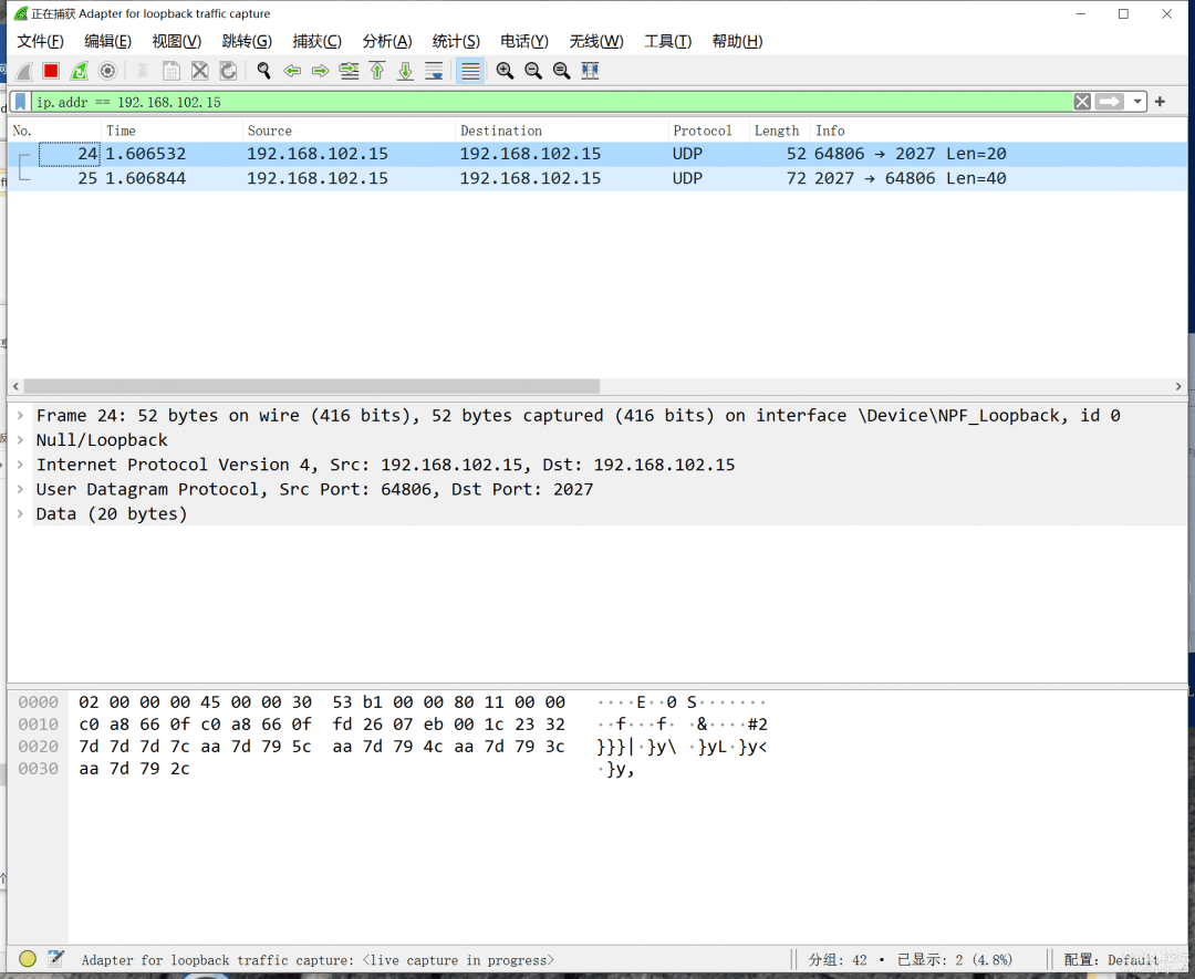 Wireshark (用于网络抓包) 选择要抓包的网卡,然后设置过滤 ip.addr == 192.168.102.15