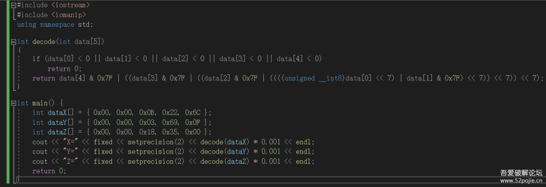 #include <iostream>#include <iomanip>using namespace std;int decode(int data[5]){if (data[0] < 0 || data[1] < 0 || data[2] < 0 || data[3] < 0 || data[4] < 0)return 0;return data[4] & 0x7F | ((data[3] & 0x7F | ((data[2] & 0x7F | ((((unsigned __int8)data[0] << 7) | data[1] & 0x7F) << 7)) << 7)) << 7);}int main() {int dataX[] = { 0x00, 0x00, 0x0B, 0x22, 0x6C };int dataY[] = { 0x00, 0x00, 0x03, 0x69, 0x0F };int dataZ[] = { 0x00, 0x00, 0x18, 0x35, 0x00 };cout << "X=" << fixed << setprecision(2) << decode(dataX) * 0.001 << endl;cout << "Y=" << fixed << setprecision(2) << decode(dataY) * 0.001 << endl;cout << "Z=" << fixed << setprecision(2) << decode(dataZ) * 0.001 << endl;return 0;}