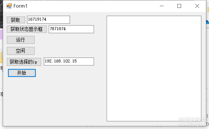 void sendMsg() {// 从程序中获取选定的IP地址EndPoint point = new IPEndPoint(IPAddress.Parse("192.168.102.15"), 2027);var buffer = new byte[]{0x7d,0x7d,0x7d,0x7c,0xaa,0x7d,0x79,0x7d,0xaa,0x7d,0x79,0x7c};client.SendTo(buffer, point);EndPoint point2 = new IPEndPoint(IPAddress.Any, 0); //用来保存发送方的ip和端口号byte[] buffer2 = new byte[1024];int length = client.ReceiveFrom(buffer2, ref point2); //接收数据报var status = ~(buffer2[12] ^ 0x82) & 0xFF;if (status == 0) {if (preStatus != status) {// 系统提示//MessageBox.Show(form,"切割完成");}Console.WriteLine("空闲");SendMessage(statusHwn, WM_SETTEXT, 20, new StringBuilder("空闲"));} else {Console.WriteLine(".");SendMessage(statusHwn, WM_SETTEXT, 20, new StringBuilder("运行"));}preStatus = status;}