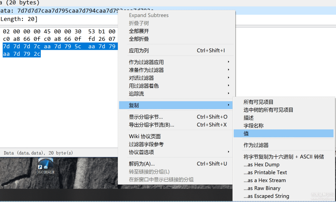 这个是发送的16进制数据,看Ascii码明显是加密过的可以使用右键复制值,或则…as HEX Dump