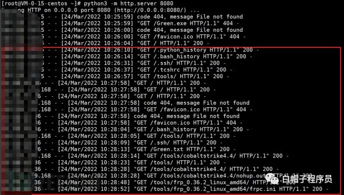 2、经过Python http服务的日志分析,可以观察到一些敏感文件已经被防守队提取,".bash_history"、"frpc.ini"等等。需要立刻查看这些文件的内容,模拟防守队在得知这些内容后可能带来的危害,再对当前服务器进行加固。