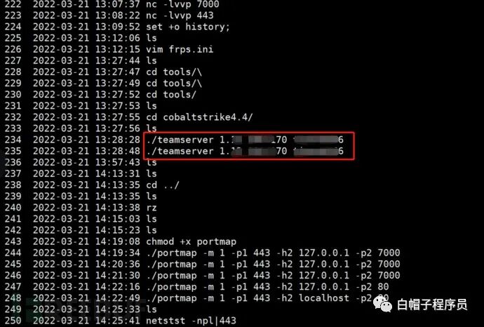 (2)历史CS teamserver(1.x.x.x)的启动记录,不过幸好我们的CS搭建在另一台服务器(110.x.x.x)上,且默认端口已经做了修改,这条命令只是当时测试CS用到的命令,不过仍然泄露了历史使用过的CS密码(xxxxxxx6),而这个密码恰好也用在了我们的C2服务器(110.x.x.x)上。