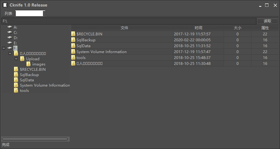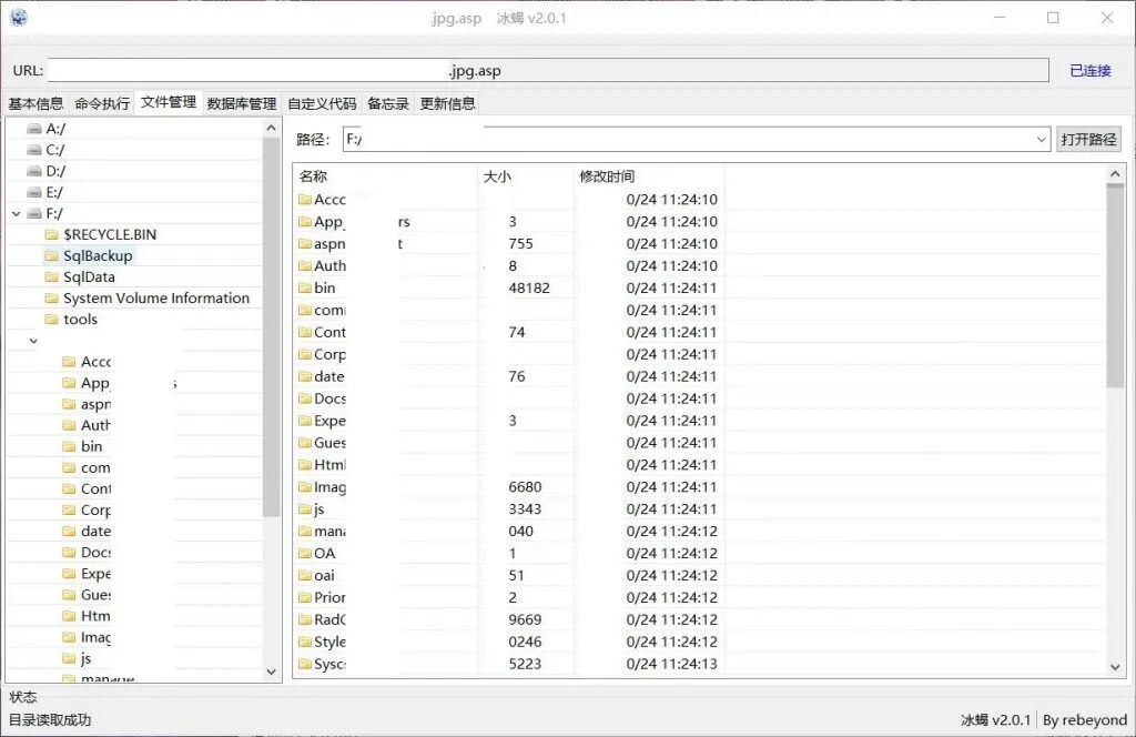 打开菜刀,成功拿下。美中不足的就是中文目录乱码了,上了冰蝎马。
