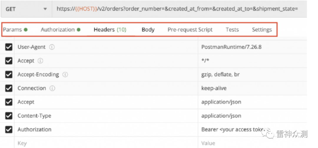 通过点击单个的API调用,完整的API请求将在右边被看到。此外,请求的不同部分将被分成若干部分,如参数、授权、头信息、请求正文等。这样方便于我们研究每个部分。