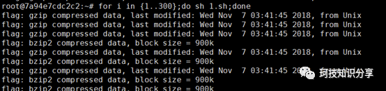 存在一个flag.gz,解压后变成bzip,再解压还是bzip,需要不断解压多次,每次随机为两种压缩格式。就是一个套娃压缩文件,需要写bash脚本来进行解压。