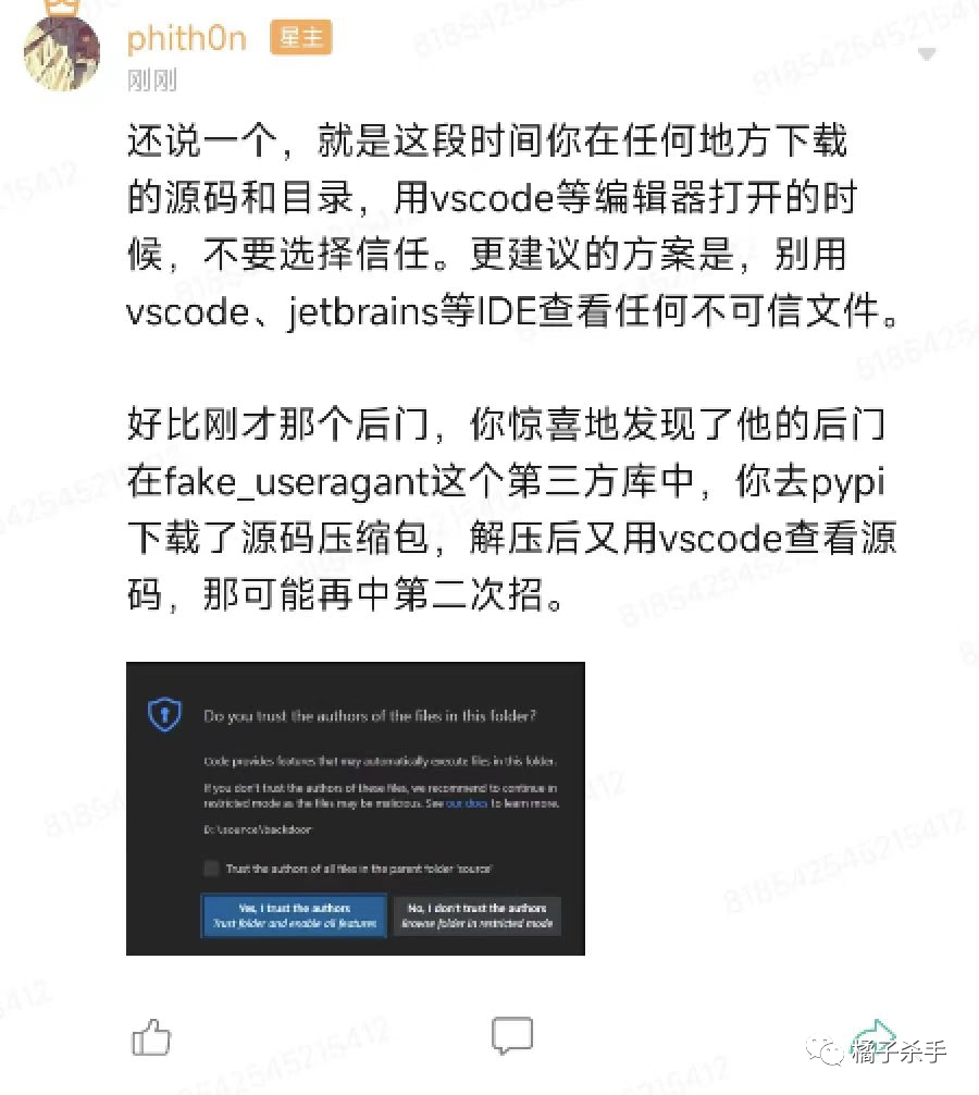 至此,还剩最后一个问题,就是网传用 vscode 打开之后,点击信任文件夹也可能会被日。那么到底存不存在这种可能性呢?如果可能的话,那么具体要如何复现呢?