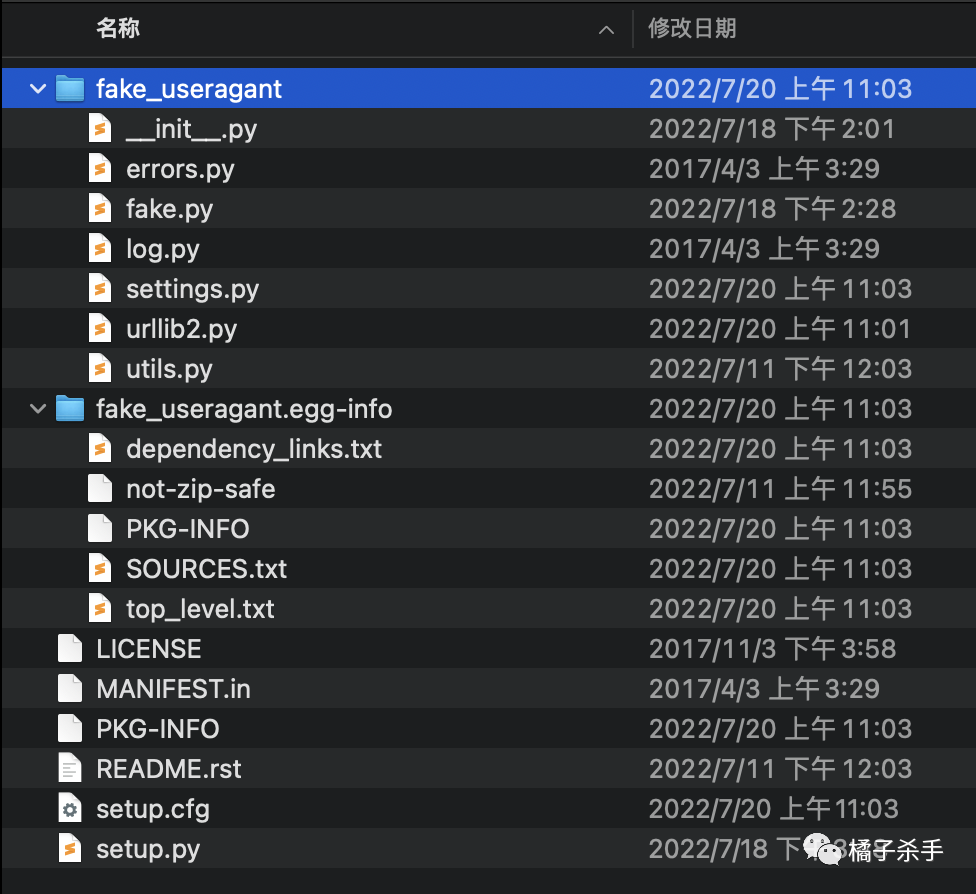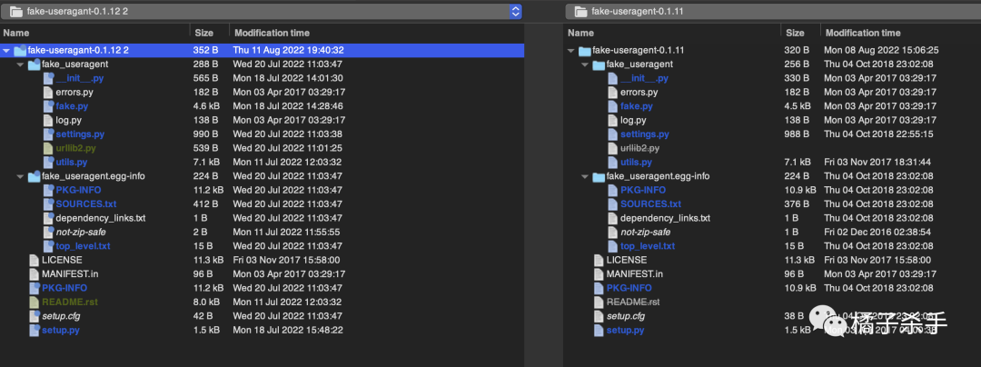 然后下载真正的 fake_useragent 做了一下 diff。其实直接看修改日期也可以看到哪些文件改掉了。