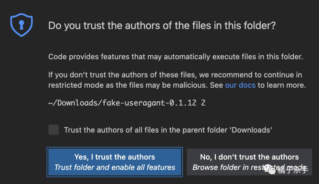 最后再说一点,vscode 在信任的时候有个选项,可以勾选是否信任父文件夹,这个一定要谨慎打钩。一个常见的攻击场景是,某安全工程师由于经常需要下载源码预览,为了方便就把整个下载目录设为可信目录。这个时候只要下到一个带有 .vscode 的恶意源码就会中招