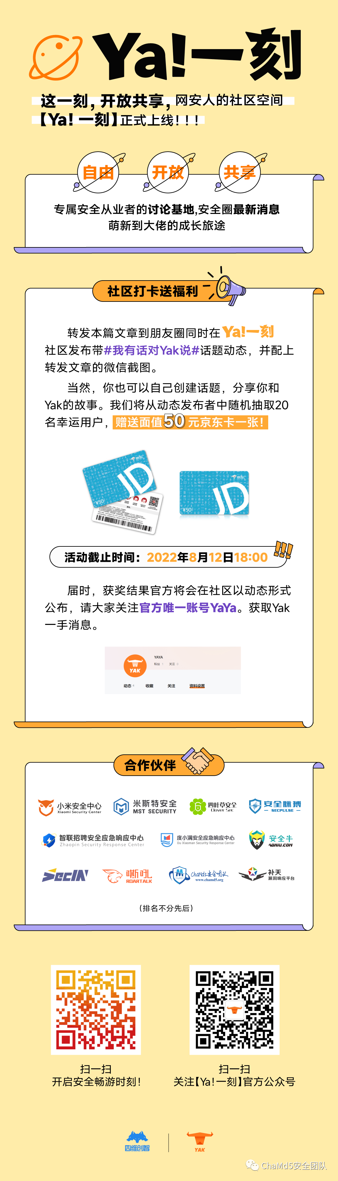 说了这么多,其实就是想真诚地邀请大家来【Ya!一刻】逛一逛,玩儿一玩儿,如果这里真的有什么东西能吸引你停下片刻,我们绝对欢迎各位注册并入驻社区,一起打造一个专属网安人的社交平台!