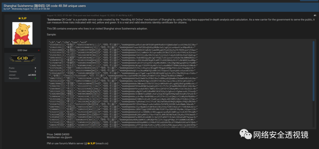 继上个月xx数据外泄,。本月外网在出售xx 随申码数据。
