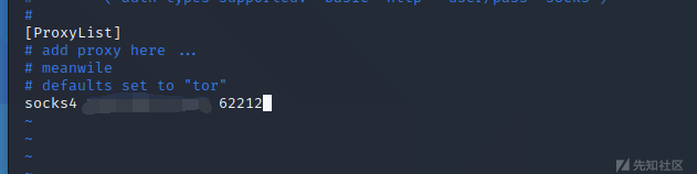 sudo vim /etc/proxychains.conf在最下面插入一行CS的ip和刚刚开的端口