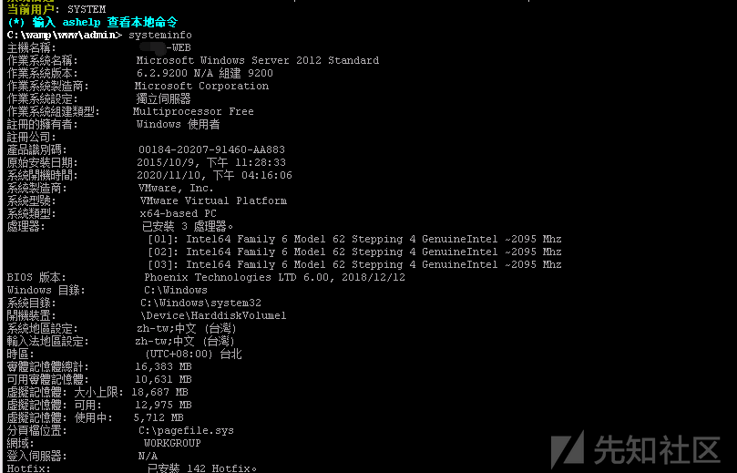 从上面可以得知,当前用户为system,server2012的服务器,有内网环境,安装了杀软ESET NOD32。
