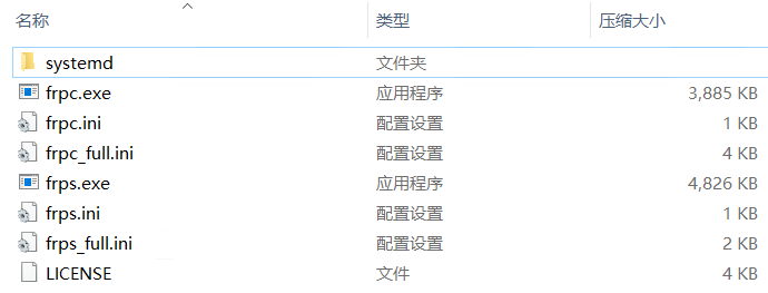 frp 是一个专注于内网穿透的高性能的反向代理应用,支持 TCP、UDP、HTTP、HTTPS 等多种协议。可以将内网服务以安全、便捷的方式通过具有公网 IP 节点的中转暴露到公网。frp项目官网地址是:https://github.com/fatedier/frp/,下载解压后可以发现7个文件,frpc和frps分别为客户端和服务端可执行程序,frpc.ini和frps.ini,分别为客户端和服务端配置文件,frpc_full.ini和frps_full.ini分别为客户端所有配置项和服务端所有配置项。