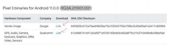 网:https://developers.google.cn/android/drivers可以找到对应系统版本和手机设备的驱动文件。此处需 要编译的设备为pixel 3手机,手机系统版本为:android-11.0.0_r46,代号为:RQ3A.211001.001。在驱动 官网找到对应的驱动文件如下: