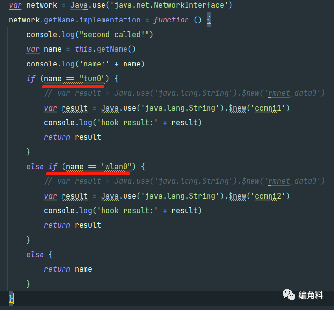 这区别是不是很大啊,所以,其实,大部分的vpn检测就是对tun0的检测,那我们再搞个hook vpn检测的frida脚本是不是就搞定了好像说得通,那么,还愣着干嘛,搞起来啊,这下面的就是主要的逻辑