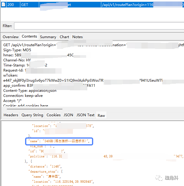 然后charles看结果,ok,完美抓到包,返回的结果刚好就是刚才就是手机页面上显示的推荐路线![]()