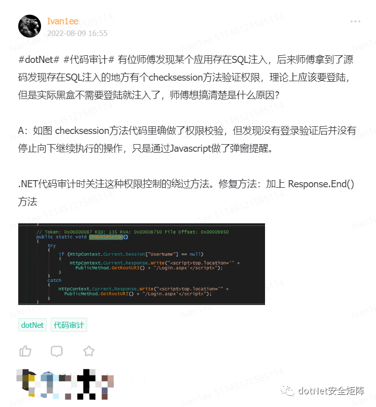 有位师傅发现某个应用存在SQL注入,后来师傅拿到了源码发现存在SQL注入的地方有个checksession方法验证权限,理论上应该要登陆,但是实际黑盒不需要登陆就注入了,师傅想搞清楚是什么原因?