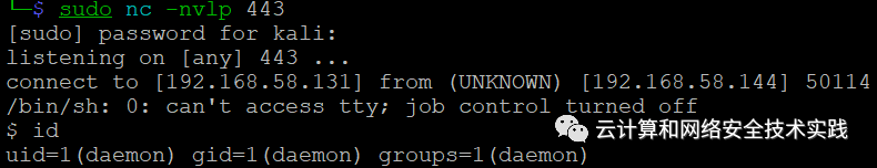 kali攻击机这边开一个反弹shell监听,sudo nc -nvlp 443,