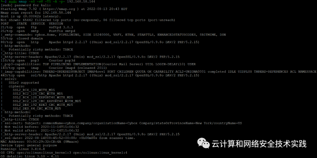 进行端口扫描,sudo nmap -sS -sV -T5 -A -p- 192.168.58.144,
