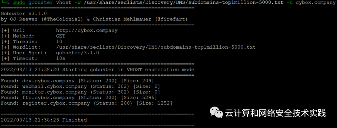 sudo gobuster vhost -w /usr/share/seclists/Discovery/DNS/subdomains-top1million-5000.txt -u cybox.company,