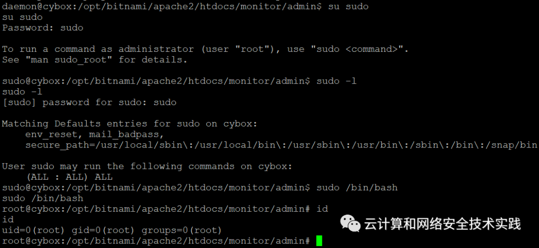 su sudo切到sudo账户,sudo -l确认有/bin/bash的执行权限,