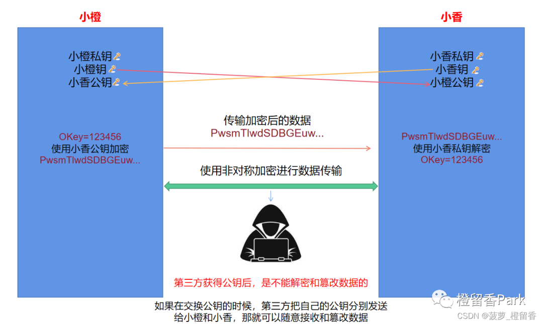 非对称加密(也称为公钥加密):指的是加、解密使用不同的密钥,一把作为公开的公钥,另一把作为私钥。公钥加密的信息,只有私钥才能解密。反之,私钥加密的信息,只有公钥才能解密。最常用的非对称加密算法:RSA