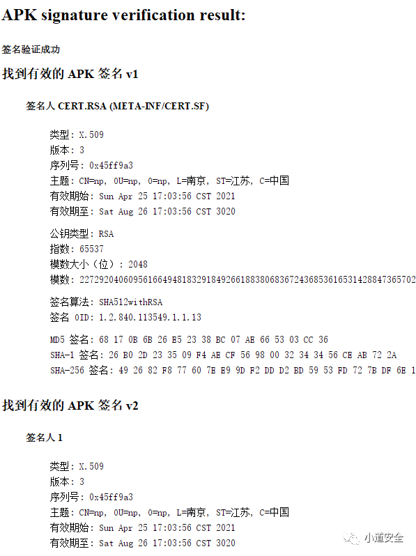 CERT.RSA包含数字签名以及开发者的数字证书。CERT.RSA里的数字签名是指对CERT.SF的摘要采用私钥加密后的数据;