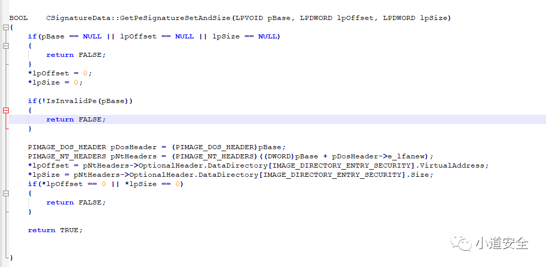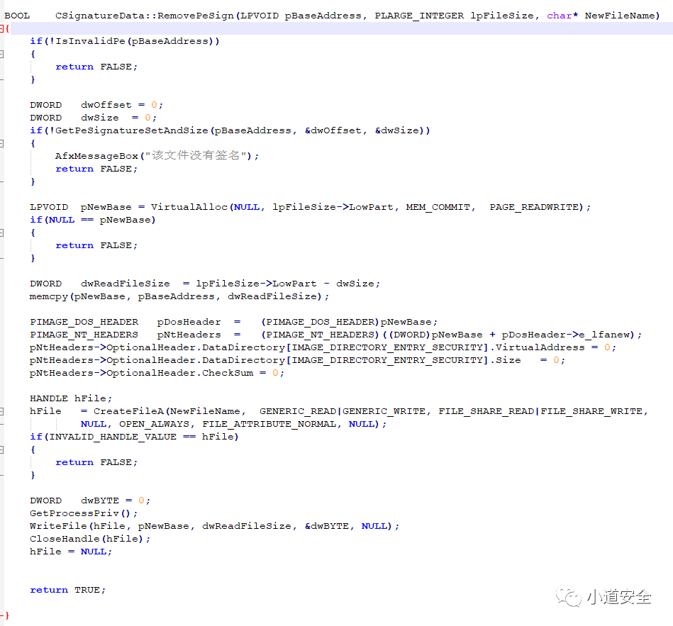 代码实现校验程序是否有签名,它本质上就是被加密的hash和发布者的数字证书被插入到要签名的软件,最后在进行校验签名信息。