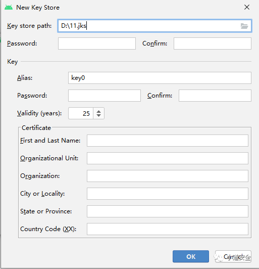 在 Android Studio中通过上图创建签名信息后,最终会生成一个 .jks 的文件,它是用作证书和私钥的二进制文件。