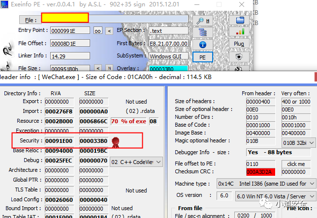 下图通过PE工具,可以查看这个字段Security的虚拟地址和大小不为空那么表示应用程序经过签名的。