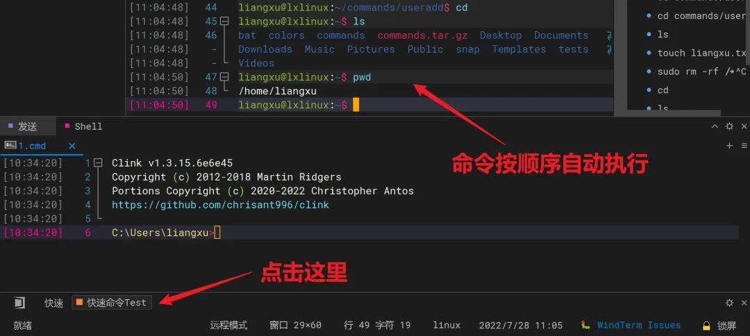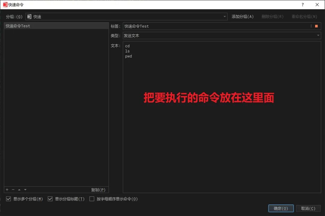 所谓的快速命令,就是类似于脚本,你可以把要执行的命令放在快速命令里,然后执行这个快速命令,它就会把里面的命令按次序执行。
