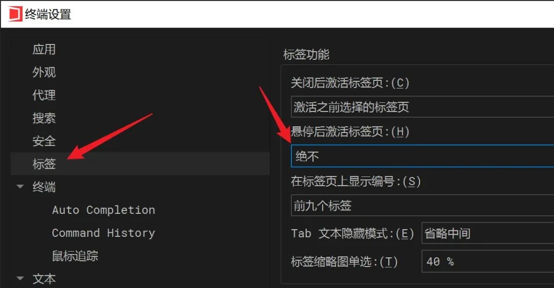 WindTerm 有个功能我不是很喜欢,就是你把鼠标放在标签上,它就自动激活那个标签。我们可以手动关闭这个功能。