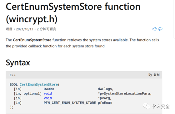 通过查询微软官方文档可知,此API会为每个找到的系统存储调用参数四提供的回调函数,这给shellcode提供了执行的机会。