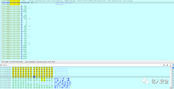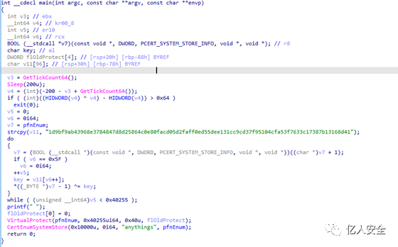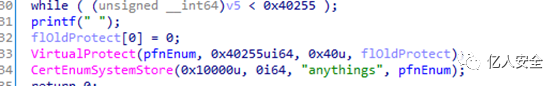 直接对CertEnumSystemStore下断点,在执行前一刻dump下解密后的pfnEnum开头的0x40255大小的内存,拖入IDA.