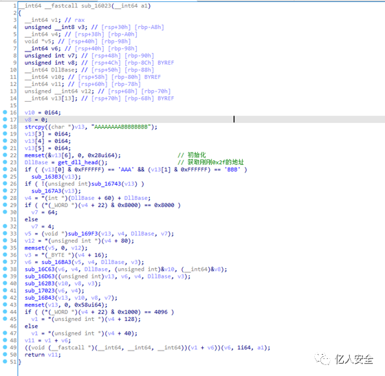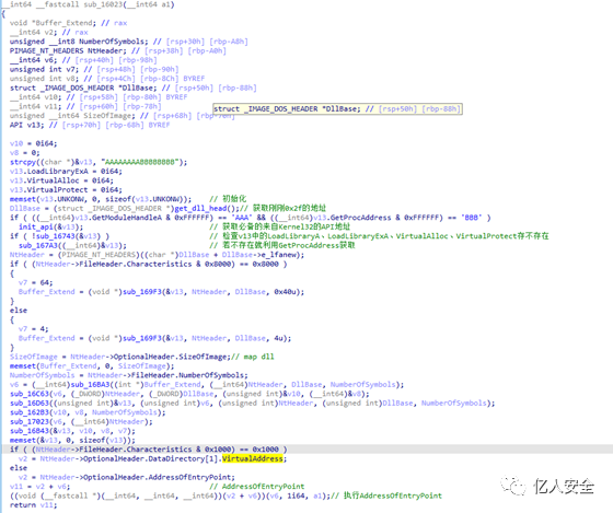 }API, * PAPI;再下边就是在内存展开、修复导入表...最后找到入口点并执行,所以sub_16383功能为内存加载Dll。