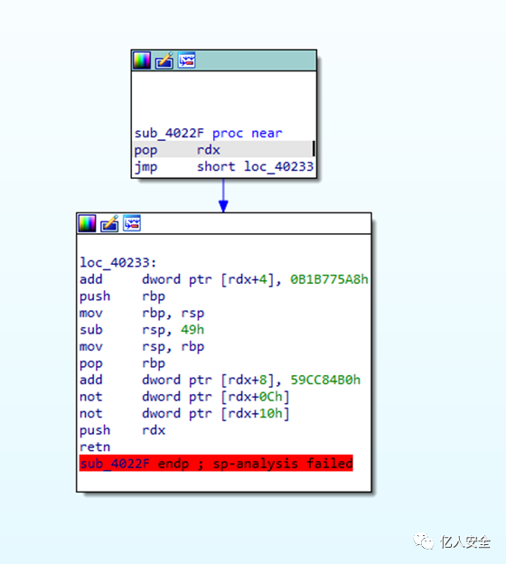 开头pop rdx将返回地址取到rdx,对返回地址后续进行一系列解密操作。在sub_4022f处下断,重新dump整个shellcode(这里注意断下后取消断点再dump,否则会将软件断点int3 也dump下来),拖入IDA。