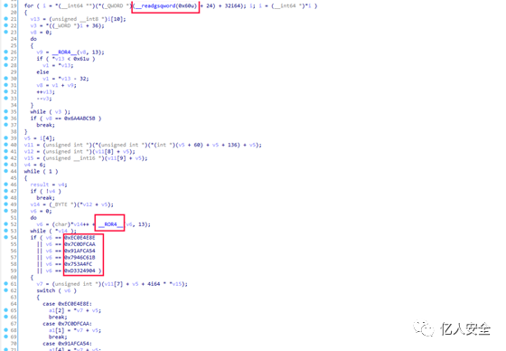根据读gs:[60h]以及ROR4可以推测sub_16383主要功能是根据HASH获取API地址。