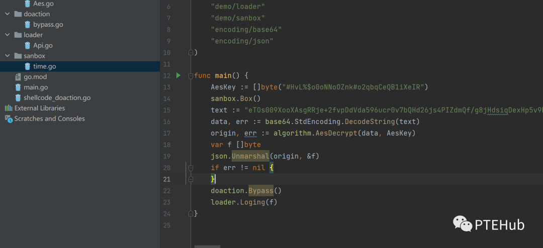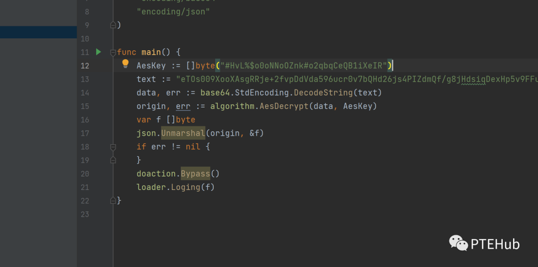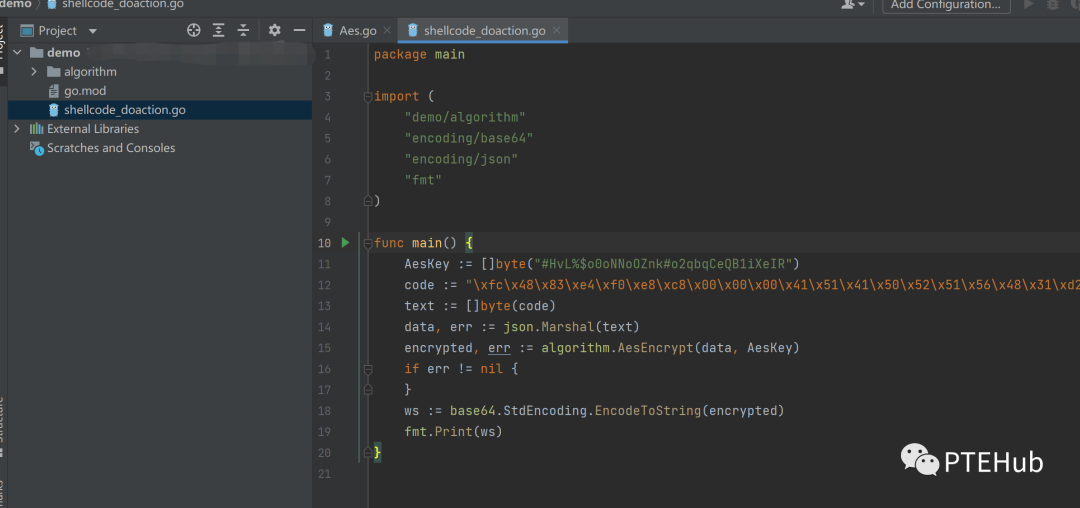 整体流程就是先定义好密钥然后将shellcode序列化在进行AES加密最后base64输出。