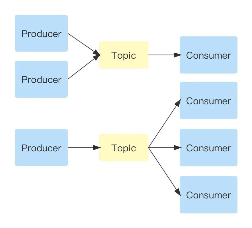 发布订阅模式需要进行注册、订阅,根据注册消费对应的消息。多个生产者可以将消息写到同一个 Topic 中,多种消息可以被同一个消费者消费。一个生产者生产的消息,同样也可以被多个消费者消费,只要他们进行过消息订阅。